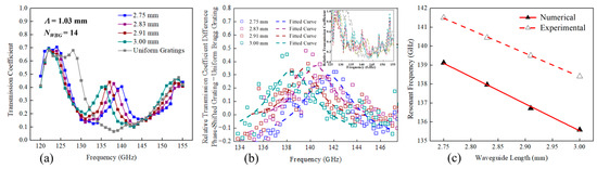 Because of the standing waves formed inside of the photomixer silicon lenses and free-space cavities of the CW-THz spectroscopy setup, parasite ripples are superimposed on measured transmission spectra [36], posing challenges in identifying the transmission peak of phase-shifted WBGs from the experimental data. To simplify the task, we identify the resonant peak position by subtracting the transmission spectrum of a uniform WBG from the spectra of the phase-shifted WBGs (see Figure 3b). A good correspondence between experiment and theory is found for the spectral position of a transmission peak as a function of the cavity length, with an exception of a small systematic frequency shift of ~2 GHz as seen in Figure 3c. We believe that this consistent discrepancy is mainly attributed to the structural nonuniformity of experimental gratings, which results in the longer equivalent F-P cavity compared with that of the ideal numerical model. Both in theory and experiment, the dependence is linear, with a slope of ~14.5 GHz/mm.