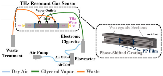 Finally, we demonstrate real-time THz gas sensing based on our thus-designed phase-shifted WBG. A 2.5 cm long phase-shifted grating module containing a cavity of LF-P = 2.75 mm in the middle of 14-period gratings with Λ = 1.03 mm was sealed on both ends with polyethylene film (α < 0.01 cm−1 for a lower-terahertz band) with a thickness of tens of micrometers. In experiments, the addition of such a THz transparent material led to negligible changes in the transmission spectra of this module. To couple with the free-space THz beam for characterization, this module was placed between two 3 cm long featureless two-wire waveguide sections which support broadband operation. The assembled waveguide component was then fitted with conical horn antenna and placed inside the THz spectroscopy setup (see Figure 4). It is noted that three through holes were drilled on the side wall of the enclosure of the phase-shifted grating module for gaseous analyte delivery.