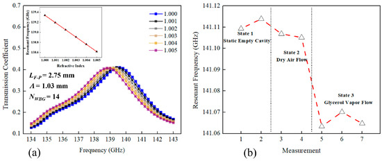 The numerical simulations of the independent phase-shifted grating module predict that the spectral position of a transmission peak is linear with the gaseous analyte RI with the corresponding sensitivity of 144 GHz/RIU (see Figure 5a). Given the 10 MHz resolution of our CW-THz spectrometer, the theoretical resolution of our sensor is then estimated to be 7 × 10−5 RIU, which is as much as an order of magnitude lower than the RI difference between most common gases (e.g., the difference is on the level of 10−3 to 10−4 RIU) [38]. In experiments, the transmission spectra of a phase-shifted WBG with an empty cavity, the cavity with dry airflow, and the cavity with glycerol vapor flow were measured subsequently. In dynamic measurements covering the spectral range of a transmission peak, the scanning time for a single data point was ~10 s to alleviate the impact of the inherent latency of a CW spectroscopy system using lock-in acquisition, and to ensure fine spectra with 10 MHz resolution. The center position of a transmission peak was found by first fitting a data cloud of the normalized phase-shifted WBG transmission spectra within the grating stopband using smooth Lorentzian lineshapes,