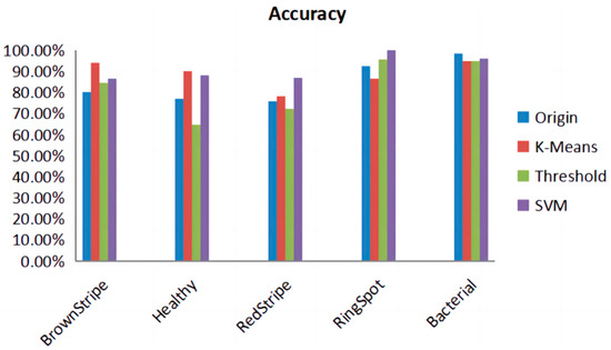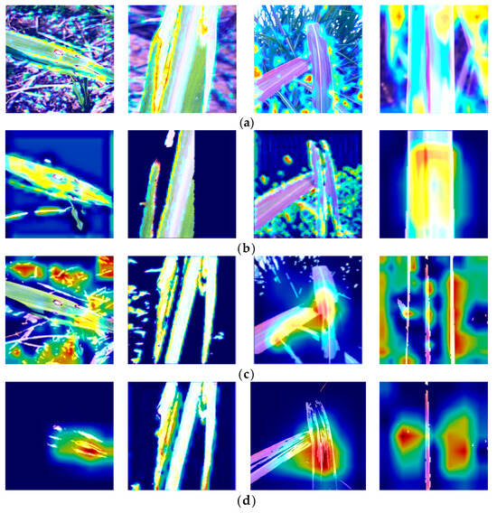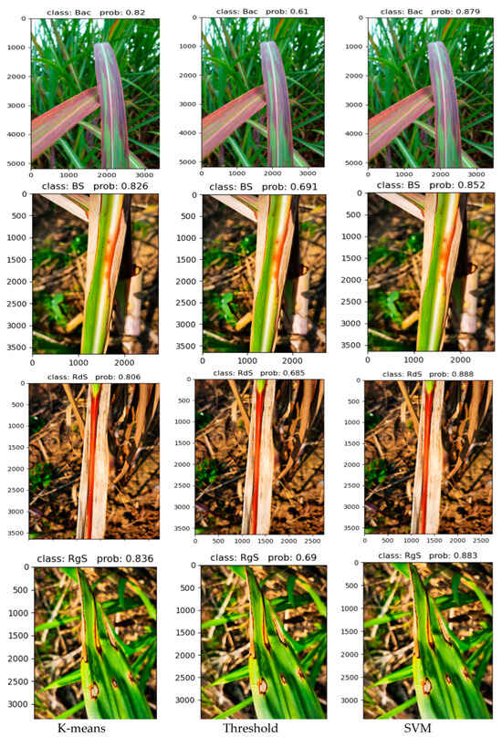 - In the training set of the dataset, the threshold, K-means, and SVM algorithms are used to segment the lesions in the images. These segmented lesion images are then used to train the SE-VIT network to extract lesion features. Through comparative experiments, we found that using the SVM algorithm achieved the highest accuracy in disease spot extraction, reaching 89.57%. Furthermore, through heat map analysis, we observed that the regions of interest (ROIs) generated by the SVM algorithm were larger than those produced by the K-means and thresholding algorithms, indicating a better capture of disease spot information. Furthermore, in the heatmap, it can be observed that when using the threshold and K-means algorithms for feature extraction, the heat distribution focuses on areas other than the lesions. However, in the heatmap generated by SVM for lesion extraction, the color distribution primarily concentrates on the lesion areas, indicating better results. Therefore, the SVM algorithm for lesion extraction, combined with the network proposed in this paper, is more suitable for diagnosing diseases in sugarcane leaf parts in complex real-world environments.