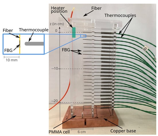 The thermocouples were inserted from the side wall and positioned so that the tip of each sensor was as close to the fiber as possible; see insert in Figure 1. Thermocouples of type K were glued in place with flexible silicon (Weicon ref. Flex 310M). In total, there were 23 thermocouples in the side wall, each corresponding to an individual FBG, the last FBG being in the bottom plate.