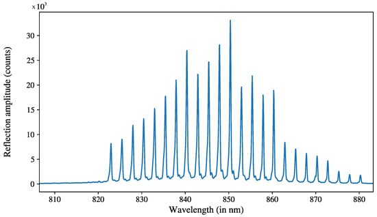 The fiber was connected to a broadband spectrometer (FiSens ref. FiSpec FBGX152, FiSens, Braunschweig, Germany) with an emitting spectrum ranging from 795 nm to 885 nm. The FBGs were each assigned a reference wavelength by the manufacturer, from 822.5 nm for the first one at to 880 nm, and spaced every 2.5 nm, ensuring that the spectrometer spectrum encompassed the FBGs’ reflections. The optical fiber’s temperature variation coefficient was K−1, according to the manufacturer. An example of the reflected spectrum is shown in Figure 2. The wavelength data were read and converted into temperature with the proprietary software of Fisens (FiSens ref. BraggSens v. 1.81). The reflected wavelength for each FBG was extracted from the reflected light signal using Gaussian peak detection [33]. We assigned fitting windows of 2.5 nm centered on the reference wavelength of the FBG and obtained the reflected wavelength from the fit results. The difference between the reference and measured wavelength allowed us to deduct the temperature difference thanks to the temperature coefficient; in our case, the displacement was typically below 0.1 nm.