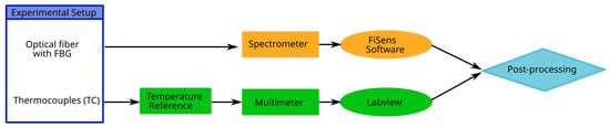 To ensure the high precision of the thermocouples, they were connected to an external temperature reference (Klasmeier ref. Isotech TRU 937/50, Klasmeier, Fulda, Germany), which, along with custom calibration, ensured a precision of 0.03 K. Thermocouple measurements were read by a digital multimeter (Keithley ref. DAQ6510, Keithley, Cleveland, OH, USA) through multiplexer cards (Keithley ref. 7710) with an acquisition time of 1 s. Both types of temperature data, from the FBGs and thermocouples, were post-processed and compared using a Python script. An overview of the data acquisition process is shown in the flowchart in Figure 3.