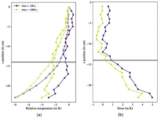 Figure 4 shows the reconstructed vertical profile of the temperature for two time steps (100 s and 1000 s) after initiating the cooling process. The thermal relaxation time for this configuration was approximately 4000 s. The temperature profiles delivered by the FBGs (solid lines) were compared to the benchmark data provided by the thermocouples (dashed lines). The temperature profiles revealed a clear gradient across the vertical positions, showing that spatial temperature variations were successfully measured from the FBGs along the single fiber. For the upper half of the column, both the gradient profile and amplitude measured by the optical fiber agreed well with the results recorded by the thermocouples. To quantify this comparison, we defined the measurement error as the difference between the temperature measured by the FBG and extracted from our correction procedure and the thermocouple data. We plotted this quantity as shown in Figure 4b, and it became obvious that the error was very low in the first half of the column, confirming the accuracy of the fiber measurements. However, we could see that on the bottom of the column, starting from cm, the fiber measurements started to significantly diverge from the benchmark values, and the error increased with an increasing distance from the reference sensor at the top of the fiber. It seems that in this case, the applied correction was not able to compensate for the influence of strain over the entire fiber, particularly at points far away from the reference. For comparison, the same correction was applied with the reference point at other positions of the fiber: at the bottom of the column, cm, and at half-height, cm. However, this variation did not solve the problem. The reference point initially chosen was able to accurately maintain the temperature profile in its vicinity, while significant deviations from the benchmark data occurred at greater distances from the reference point. We observed that choosing a reference point with a stable temperature (here, at the top of the fiber) was the best choice with the smallest deviations.