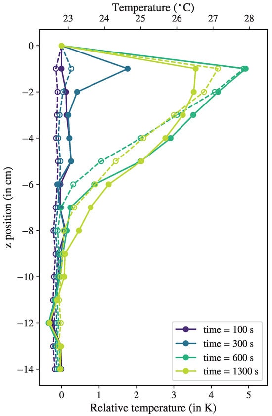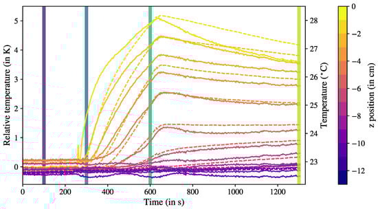 Temperature time evolution with local heating of thermocouples (dashed lines) compared with FBG readings (solid lines) corrected with respect to reference sensor. Left axis gives the relative temperature, right axis gives the absolute scale by taking the reference temperature as the time-average of the thermocouple data at the reference sensor, at cm. Vertical solid lines corresponds to the times at which temperature profiles were computed in Figure 6, from purple to green at 100 s, 300 s, 600 s, and 1300 s.