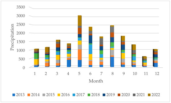 The Taoyuan monthly rainfall from 2013 to 2022.