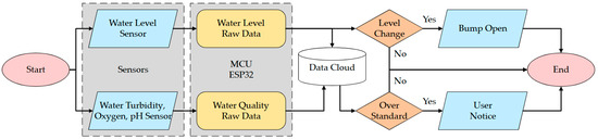The detailed workflow is shown in Figure 7. Our system was mainly divided into two parts: the water quality monitoring module and the water level monitoring module. In the water quality module, after the raw data were successfully collected by different sensors through the ESP-32, the data were uploaded to the data cloud and stored in case of need. Furthermore, if the water quality was below the standard value the system set up, the user received a system notice through an application. If not, the cycle kept running. In the water level module, when the water hit the numbered sensor, the system performs two actions according to the following: First, the data were analyzed through the Mega 2560 board and it was judged whether the water level was too high or not. If the water was too high, the bump which transports the water to other ponds turned on automatically to soothe the flood. Second, the relative water level was uploaded synchronously to the cloud for subsequent data analysis.