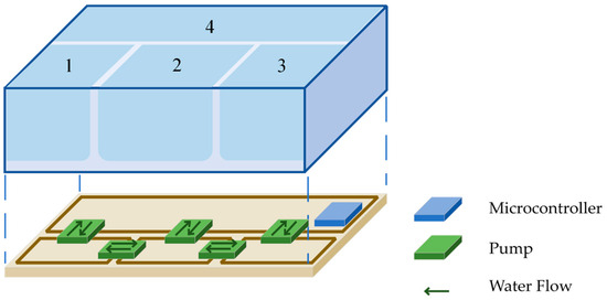 Due to the potential interference that the system may encounter in its practical field implementation, this article establishes a scaled-down proportional model based on the actual field conditions to validate the system’s operation and functionality. After the completion of the prototype, the system will be deployed in the field for real-world application. A scaled-down acrylic model (70 cm × 70 cm × 34 cm) was fabricated to simulate real-world water level control scenarios in natural environments. The model comprised four adjacent water pools of varying sizes. Soil moisture sensors were installed at four equidistant heights in each pool, defining four water level standards from bottom to top. The microcontroller and motor were positioned directly below the pool model, as depicted in Figure 9.