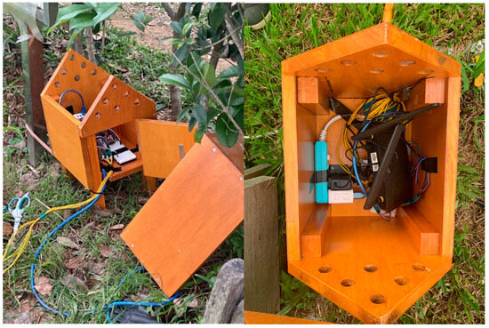 The sensors located in the ponds are housed in a small monitoring house made of wood as shown in Figure 12. The cabin is painted with multiple layers of outdoor wood protection paint to withstand environmental conditions. The small house incorporates magnetically attached doors, allowing easy access to the internal components for maintenance purposes. For heat management, the cabin features a spacious, movable eave and ventilation holes strategically placed in the roof section. This design facilitates effective heat dissipation and ensures that the electronic devices within remain at optimal temperatures. The electronic components of the sensors submerged in the water are encapsulated in electronic sealant. This provides an additional layer of waterproofing, making the devices well-suited for prolonged underwater operation without the risk of water infiltration.