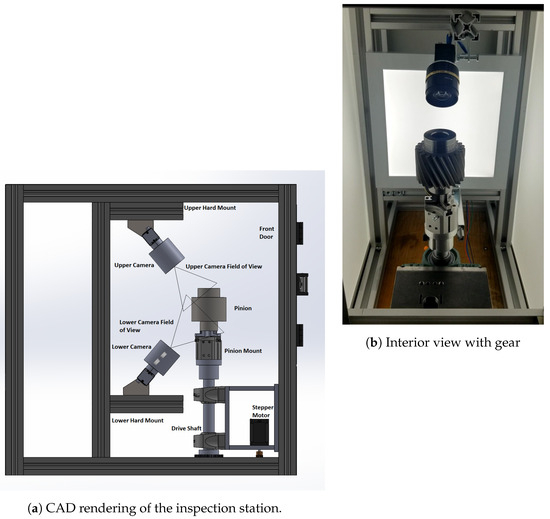 Within the inspection cell, two cameras are used to take images of the gear from opposing directions, and a pinion mount is used to rotate the gear continuously. The pinion mount is driven by a 17HS24-2104S NEMA 17 standard stepper motor [16], while the two cameras are Teledyne FLIR BFS-U3-27S5M-C cameras [17] with Tamron M23F08 lenses [18]. The camera types and specification represent a major change from the earlier station design reported in Grant [14] and used by Allam et al. [1], which prioritizes shorter exposure times with lower absolute sensitivity thresholds and a larger light capture surface area per pixel. Two 4400-lumen panels are attached to the left and right walls of the inspection cell, and a 1600-lumen panel is attached to the back of the cell behind the cameras and illuminates the gear. The cameras are mounted at an angle to reduce shadow effects on the gear and to allow for full imaging of the gears’ surface.
