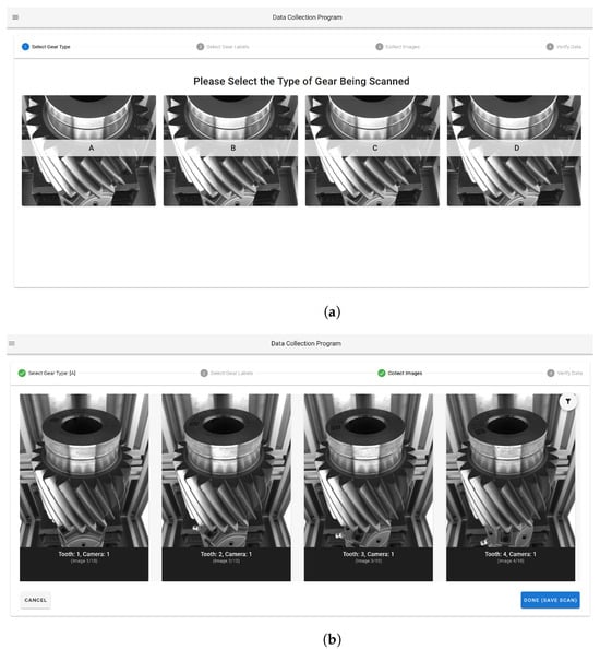 Different views from the HMI. The top bar in each view shows the current phase of the scanning operation. (a) Welcome Screen: The operator first selects the type of gear (A, B, C, or D), as well as relevant defect labels. The gear type is used to determine how many teeth (and thus images) need to be collected; type C is 26 teeth, while the others are 22. (b) Scanning and Inspection: Images and results are returned to the user. Information on each card includes the: Gear Tooth #, Camera #, Image # (out of 44 or 52 images), and any predicted defects.
