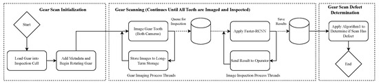 Overall inspection process diagram. During the Gear Scanning procedure, images are captured and added to a queue, where the Faster-RCNN model pulls from the queue and inspects the image for defects. These operations occur in parallel by using different thread pools.