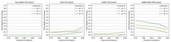 From the first three plots, it can be seen that the model can achieve a 100% accuracy in detecting NCU or Tooth type defects at a confidence threshold of and sequential images to confirm the detection. We note that FN is used here since it is critical that the system does not miss any defects on any inspected gears. However, this high sensitivity can also lead to creating many false positive detections. Each false positive will lead to manual inspection of the gear, thus defeating the purpose of this inspection cell.