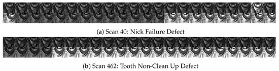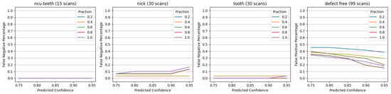 Figure 6 shows the results of training on different fractions of available data, using a consecutive image constraint of from the results of Section 5.2. The NCU-Teeth defect can be seen to remain comparatively easy to identify, even when only 20% of the labeled data are used for training. On the other hand, for the Nick defect, increasing the amount of data had a negative effect on the false negative performance. It is possible that the model may have over-fit some of these samples. In the defect-free case, it can generally be seen that training on additional samples improves (decreases) the false positive detection rate.
