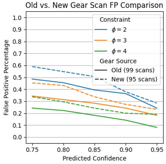From Experiment 1, the inspection parameters of and were found to yield a balanced trade-off in FP and FN performance. Using these parameters, Figure 7 reports a slight increase in false positive detections, from 24.2% (old 99 scans, solid orange line) to 27.3% (new 95 scans, dashed orange line). Given the major revisions to the inspection system carried out in the work, these results are encouraging and suggest that only a small number of scans are likely to be missed during initial deployment prior to any additional fine-tuning.