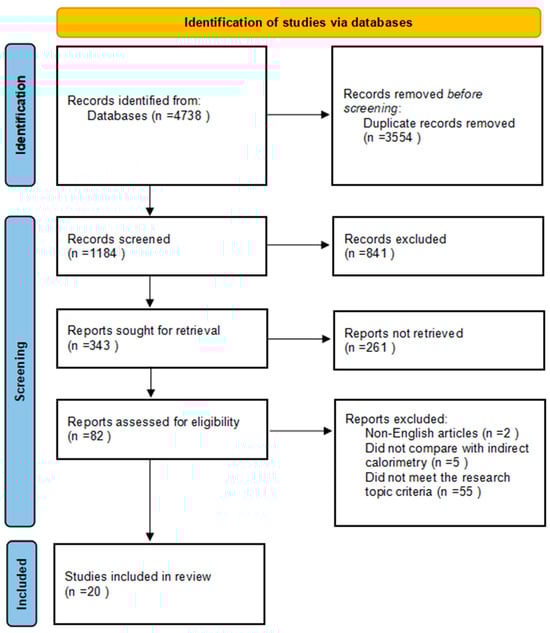 The 20 articles included in this study were categorized into three groups. The first category examined the relationship between Actigraph activity counts [28,29,30,31] and indirect calorimetry, with articles [28,29,30,31] focusing on this topic. The second category involved a comparison of energy expenditure measurements between the Actigraph and indirect calorimetry [32,33,34,35,36,37,38,41,42,43] and a comparison of different energy expenditure calculation equations [39,40,44,45,46,47].