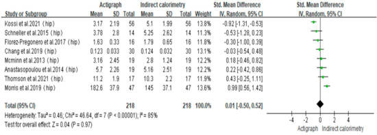 To minimize heterogeneity across studies, a meta-analysis was performed on a total of eight studies [33,34,35,36,38,41,42,43] in which participants wore the Actigraph device on their hip. The I2 statistic, with a value of 85%, suggested a substantial level of heterogeneity (p < 0.001). Consequently, a random-effects model was utilized for the analysis. The SMD is a result calculated during the process of meta-analysis, which represents the effect size between the Actigraph and IC. With the use of the SMD, a meta-analysis has the ability to consolidate various effect sizes into a single unified metric, facilitating combined analysis and comparison. The findings indicated that the combined effect size was SMD = 0.01, with a 95% confidence interval ranging from −0.50 to 0.52 and a p-value of 0.97, which is greater than the significance level of 0.05. This finding indicates that there was no statistically significant disparity observed between Actigraph and IC in their ability to measure the total PAEE (Figure 2).