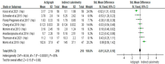 The meta-analysis conducted on measurements of total energy expenditure revealed a significant level of heterogeneity (I2 = 85%, p < 0.00001). To evaluate the sensitivity of the analysis [33,34,35,36,38,41,42,43], the random-effects model was replaced with a fixed-effects model. The sensitivity analysis revealed that the findings were consistent with the fixed-effects model (SMD = −0.01, 95% confidence interval [CI]: −0.21 to 0.18, p = 0.88 > 0.05). This statement suggests that there were no significant alterations in the fundamental findings between the two models, thereby establishing the stability and reliability of the meta-analysis results (Figure 3).