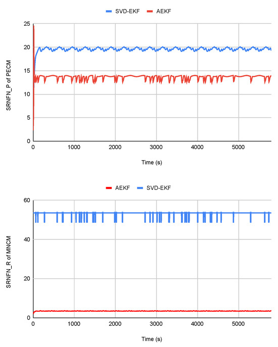 Table 2 shows the single-step run time for the two algorithms. It shows that the proposed algorithm has more computational time as compared to the SVD-EKF. Even though the computational load is higher by only a small margin, the accuracy of the proposed algorithm is significant. To demonstrate the efficacy of the proposed algorithm, we calculated the SRNFN and ASRNFN values of the predicted error and measurement noise covariance matrices, which are useful in analyzing the convergence of these matrices. An analysis of the results presented in Figure 2 and Table 3 indicate that the proposed algorithm outperforms the SVD-EKF algorithm, as evidenced by its lower SRNFN and ASRNFN values.