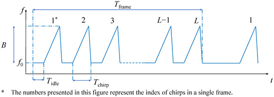 In this subsection, we briefly introduce the principle of the FMCW radar. The transmitted signal of the FMCW radar consists of a series of continuous frequency-modulated waves. The signal within a frequency modulation period is called a chirp. The transmitted FMCW signal frame consists of multiple chirps; see Figure 1 for an illustration, and all notations are listed in Table 1.