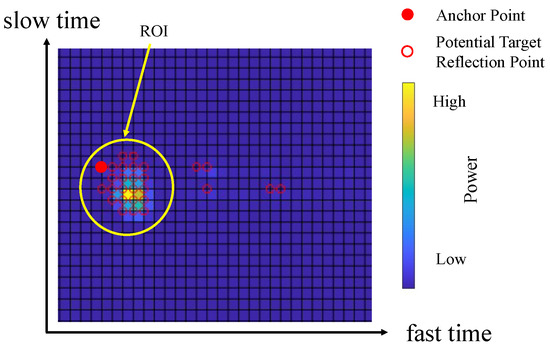 Compared to the elimination of the static part of the clutter, the signal-processing procedure for the dynamic clutter is more complicated. To reduce the impact of dynamic clutter on target detection, we develop a new detection method, as detailed in Algorithm 1. Figure 4 presents a schematic diagram for the signal-processing procedure of removing dynamic clutter. First of all, all the reflection points detected via the constant false alarm rate (CFAR) method are considered as potential target reflection points (red circles). Among potential target reflection points, the one with the highest velocity and being closest to the radar is chosen as the anchor point (red solid circle). Algorithm 1 is applied to search all potential reflection points (see the yellow circle) around the anchor point to form an ROI, and other potential target reflection points are removed in the following processes to reduce the impact of dynamic clutter.