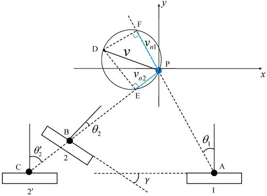 It can be noted that the normal directions of the antenna arrays of radar 1 and 2 do not need to be parallel to each other. As illustrated in Figure 5, radar 2 deployed at point B is equivalent to radar deployed at point C for estimating the same full velocity. Therefore, radar 2 can be equivalently considered as radar , which is deployed in parallel to radar 1, and the relationship between these azimuths are given as follows: