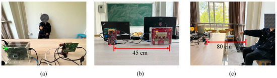The environment of the experiment and the placement of two radars: (a) experimental background; (b) specific placement of radars; (c) user-to-radar spacing.