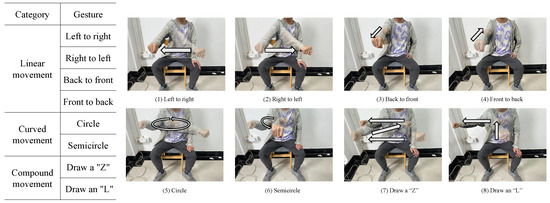 To evaluate the capability of the proposed framework in gesture recognition, we consider eight different gestures, as shown in Figure 8. The gestures can be classified into three categories, namely the linear gestures, the curved gestures and the compound ones. The linear gestures consist of four different basic gestures, e.g., left to right motion, right to left motion, front to back motion, and back to front motion, and the curved gestures contain those drawing a circle and drawing a semicircle. The compound gestures can be decomposed into a combination of several basic linear and curved gestures. For example, the compound gesture of drawing a “Z” in the plane consists of three basic gestures: left to right “→”, front to back “↙” and left to right “→”.