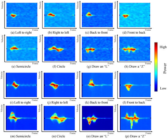 The m-D images of different hand gestures: (a–h) obtained from IWR-6843-AOP-EVM; (i–p) obtained from MMWCAS-RF-EVM.