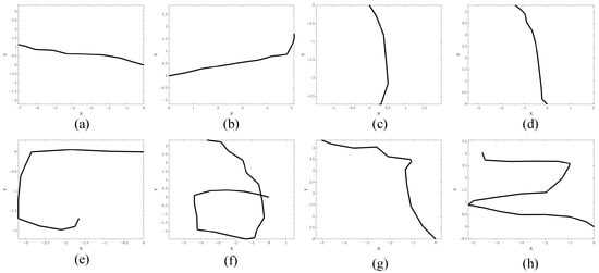 Grayscale images of eight different trajectories: (a) left to right, (b) right to left, (c) back to front, (d) front to back, (e) semicircle, (f) circle, (g) draw an “L”, (h) draw a “Z”. “X” and “Y” in figures represent the value of the motion velocity vector in the x and y directions, respectively.