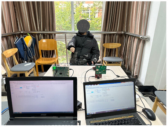 To simulate a practical environment, several chairs are placed close to the performers of the gestures, as shown in Figure 11. Due to the implementation of the time division multiplexing mode in radar transmission during the experiment, the resulting beam coverage encompassed all regions within the radars’ FoVs. Consequently, non-target objects such as chairs exerted some influence on the recognition results.