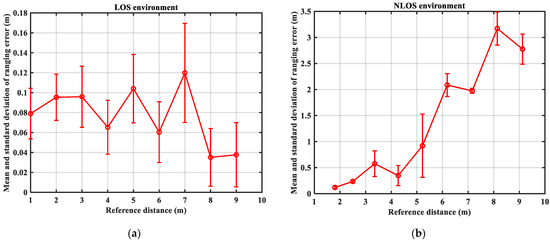 Graph of ranging error at different distances: (a) LOS environment; (b) NLOS environment.
