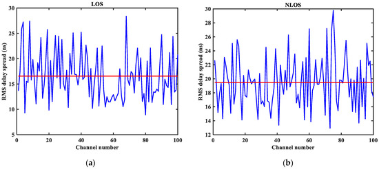 Root mean square (RMS) delay spread in LOS/NLOS environment: (a) LOS RMS delay spread; (b) NLOS RMS delay spread.