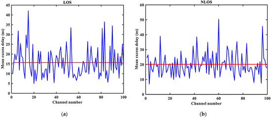 Mean excess delay in LOS/NLOS environment: (a) LOS mean excess delay; (b) NLOS mean excess delay.