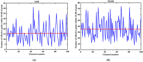 Number of effective paths with a peak within 10 dB in LOS/NLOS environment: (a) LOS number of effective paths with a peak within 10 dB; (b) NLOS number of effective paths with a peak within 10 dB.