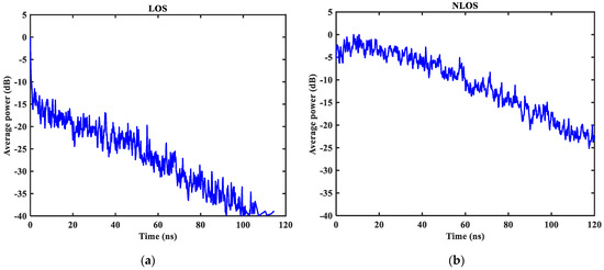 Average power decay curve in LOS/NLOS environment: (a) LOS average power; (b) NLOS average power.