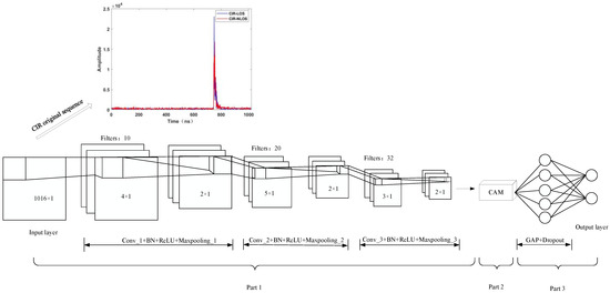 The second part adds CAM on top of the above to further enhance the feature extraction capability of the model. The Max-pooling layer in the third convolution module is used as the input of CAM, and the GMP and GAP operations are performed, respectively. Subsequently, the two pooling layers sequentially perform a convolution of 1 × 1 of the number 8, the BN layer, the ReLU function, and the convolution of 1 × 1 of the number 32. Finally, the operations of superposition, sigmoid function, and multiplication are experienced.