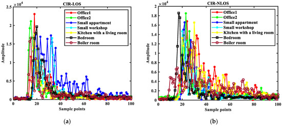 Schematic diagram of CIR sampling points in the seven environments (731 ns–830 ns): (a) LOS environment; (b) NLOS environment.