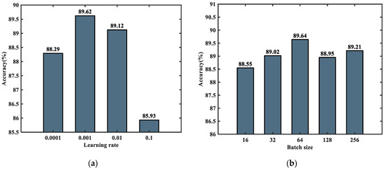 Model parameters play an essential role in the performance of the network. Suitable parameters not only improve the convergence speed in the training phase but also help to achieve better classification results. Different learning rates and batch sizes were selected to find the best value of learning rate and batch sizes for performance comparison, as shown in Figure 14a,b.
