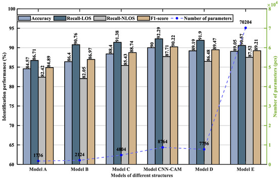 Various comparative experiments were designed to compare the proposed model’s performance: different structural models, identification methods for joint machine learning of feature parameters, and other deep learning identification methods. In addition, we use four metrics: Accuracy, Recall-LOS, Recall-NLOS, and F1-score to evaluate the model performance.