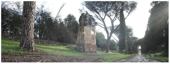 - Quilici, S. Il Parco archeologico dell’Appia antica: Un paesaggio pluristratificato. In Patrimonium Appiae: Depositi Emersi; Paolillo, F.R., Pontisso, M., Roascio, S., Eds.; SAP Società Archeologica: Quingentole, Italy, 2022; pp. 91–102. [Google Scholar]