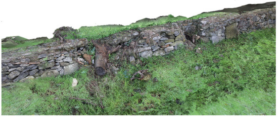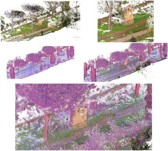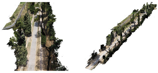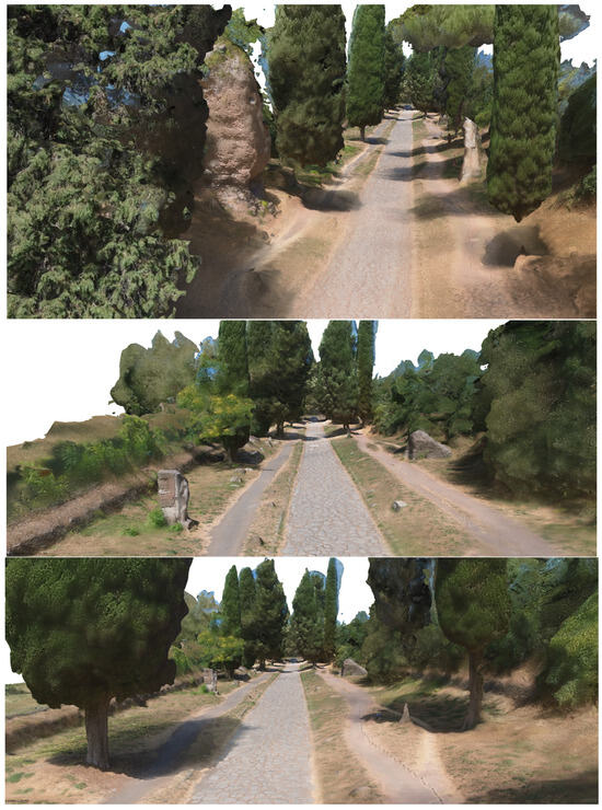 To obtain textured 3D models able to accurately describe the different layers, the different photogrammetric blocks were processed, optimising the data source and experimenting with the best merging results. In the first massive processing phase, the blocks acquired by the NIKOOR camera, integrated with the frames extracted from the 360° images, were processed all together. Then, in a second phase, the optimisation was better studied according to the morphology of the elements to be represented by removing the portions of noise and noise, as explained in Table 2. Notably: to better represents the Macére drywall on the borders and the archaeological and infrastructural details, the HR Ground image data (+UAV ground 1–5 m, where available in the test area) have been separately processed, adding the 360# video frames just in the regions lacked (i.e., for vegetation obstacles) due to the flexibility of acquisition near the ground level (as explained hereafter in Section 6.2); to represent the Vegetation Layer the 360° image blocks with the UAV tests have been coupled to gain a fully immersive 3D landscape scenery (as explained in Section 7).