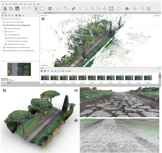 The multi-sensors photogrammetric process. (a) Photogrammetric image block (UAV and cameras) optimised for the Digital Twin of the focus area of the Sepulchre of Marco Quinti Servilio; (b) the 3D textured mesh model; (c,d) detail of the 3D textured mesh model of the Basolatum paved surface.