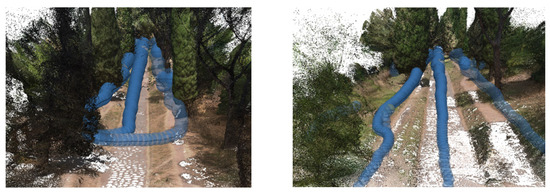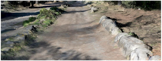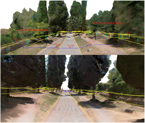 The 3D Immersive model has been obtained by merging all the 3D data, notably: (i) the 3D entities (as the longitudinal section and the carriage-wage line with discontinuity respect to the Crepidines)—the 3D line shows the altimetric ascendent volcanic geomorphology of the Appian Way with an altitude difference of 106.08 m along the 11.7 km; (ii) the 3D entities extracted from the TLS and MMS (as the movable archaeological sites and artefacts); (iii) the 3D Textured Objects models coming from the photogrammetry including the 3D vegetation, where present; (iv) the point clouds to complete the 3D perspectives views to support impact analysis of the design of the services or planning the re-vegetation. Figure 9 shows the 3D textured model (OBJ) in correspondence with the Marco Servilio Sepulchre.