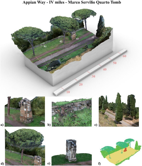 3D textured grip models of the Appian Way infrastructure section (the photogrammetric output management into pure modellers (as Rhinoceros McNeel©). Top: The textured mesh model section of about 60 m of the Marco Servilio Sepulcher: (a) Marco Servilio Tomb; (b) Macére; (c) Cypress; (d) Pinus Pinea; (e) statue of heroic figure; (f) the mesh model is the result of different photogrammetric blocks—Appian Way carriage (UAV survey, yellow), Marco Servilio Tomb (ground camera, red), Pinus pinea (UAV survey, light blue), vegetations (360° cameras, green).