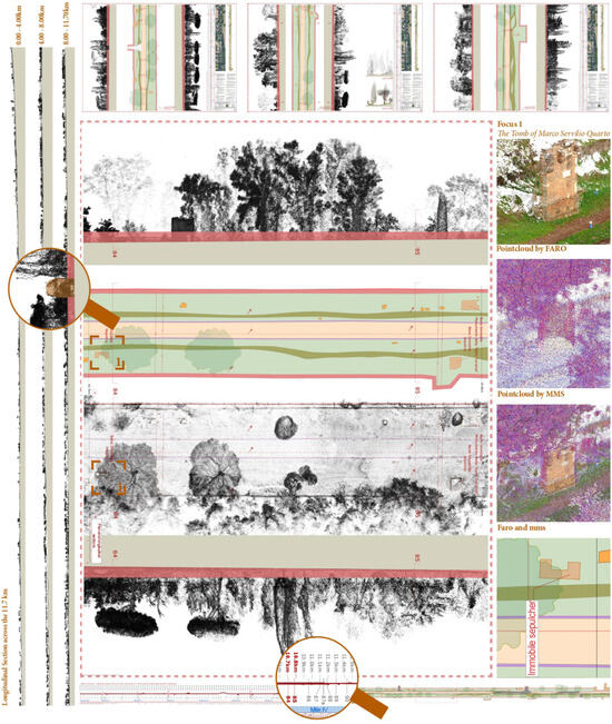 The area in correspondence with the main monuments was surveyed with a detailed static laser scanning acquisition. The 120 detailed sections were measured, and a limited number of scans (2 to 5) were acquired to obtain the requested level of detail for each section. The survey was conducted with the Terrestrial Laser Scanner (TLS) Faro Focus X130 (FARO Technologies Inc., Lake Mary, FL, USA) covering n. 120 square areas, 50 m × 50 m). For each section, the position of at least three targets was measured in RTK to provide georeferencing of the scans in national cartography (georeferencing accuracy similar to the one obtainable with RTK measurements ±3.0 cm). The Faro Focus TLS clouds have been integrated with the MMS ones and extracted different entities with different accuracies, as illustrated below (Figure 4). The Faro focus areas are addressed to the extraction of the geometric entities (carriage wage, architecture, artefacts) in correspondence with the 110 focus and integrated by the orthophoto (0–4 km); the MMS ones for the crossing infrastructures (as the railways and over passages crossing the Appian Way), landscape-vegetation along all the Appian Way sections.
