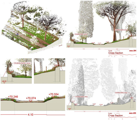 In the phase of identification of the final products, it was immediately evident that the pure 3D CAD or GIS 2.5D management of the photogrammetric result (e.g., orthophoto projected in the different planes, for example, the planimetric surface, DEM) could not be considered as the only complete tools of the complexity of the documentation and the entities to be described. Therefore, the CAD output, as shown below, becomes one of the descriptive intermediate links, although basic in the extraction phase of vertical and horizontal 3D profiles of all entities and the daily work practice of operators.