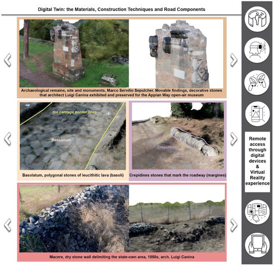 A further discussion element concerns the transition from 3D Quality Models managing the complexity [62] into the Digital Twin (DT) interpretations. The DT of the Appian way has been undertaken under different points of view upper described. Notably, the experimental XR web interactive platform is conceived to support a live Digital Twin for curators, operators and visitors bridging reality and virtual objects, with the aim of reducing ICT costs of DT platforms. It is ready to support future developments, including fluxes of data from citizens as well as IoT sensors.