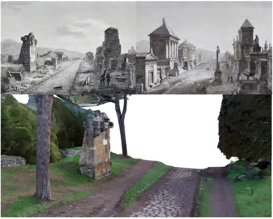 Canina represents the monument along the Appian Way without giving it much space inside the book, probably because it was not one of the resounding discoveries. Suppose the identification of the tomb is right on the scene of the road reconstruction. In that case, the tomb is represented as a funeral chapel with a rectangular plan raised on a podium. The temple has a portico with four Corinthian-order columns and an architrave. The roof is a step pyramid with a statue on top. The views can be compared to the 3D textured twin model allowing operators, curators and visitors to understand the ancient use, the state of conservation and the transformations that occurred as in the landscape case (Figure 24). After the great work of Canina for the documentation of the state of preservation of the monument is worth mentioning the role of photographs. The photographs by Pompeo Bondini (1828–1893) were shot in the same year of the completion of the Canina’s work, in 1853. Bondini is one of the first photographers in Italy and published ‘Della Via Appia e dei Sepolcri Romani’ that contained 42 salted paper prints from calotype negatives—one of the first publications in which photographs are an integral part of the written text [59]. The picture takes the monument from its right side. Two things leap to the eyes: other fragments based on the monuments and no vegetation behind the Macére. These fragments were depicted even by Canina, but they are missing from a print of the 19th century by F. Rinaldi [60] (p. 96).