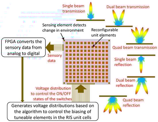 The sensing unit detects a change in the environment and converts the sensing data to a digitized information signal, which is then sent to a controller such as a microcontroller unit (MCU) and/or a Field Programmable Gate Array (FPGA). The FPGA is programmed to generate voltage distribution based on the digital code sequence. The voltage distribution controls the biasing of tunable elements in the RIS (such as p-i-n diodes or any other tunable RF switches, such as varactor diodes, Micro-Electromechanical-Systems (MEMS), or Nano-Electromechanical-Systems (NEMS)), which enables real-time control of the scattering properties of the RIS.